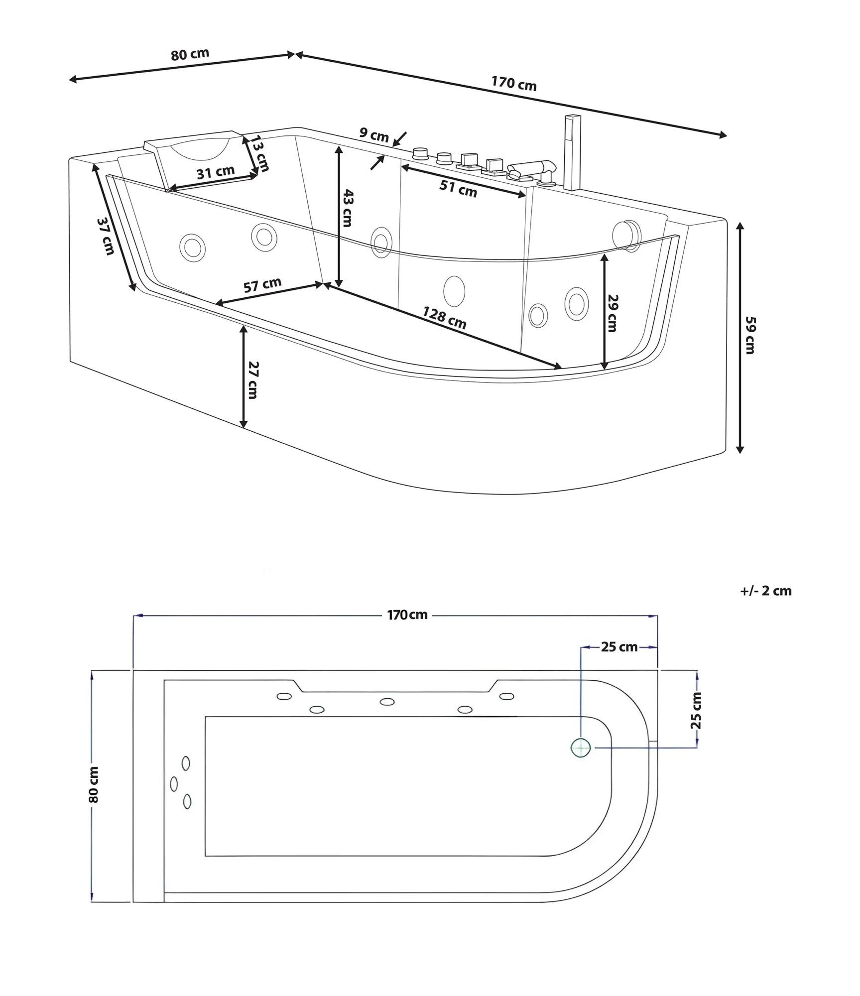 Акриловая гидромассажная ванна (джакузи) Ceruttispa C-403A R (1700х800х580), угловая, правая, 3 гидромассажные форсунки, 3 спинные гидромассажные форсунки, 10 аэромассажных форсунок, смеситель, подголовник, хромотерапия, с датчиком сухого пуска.