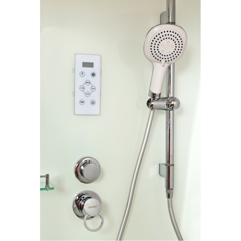 | Комплектация | Антискользящая вставка из антибактериального полимера||Латунный смеситель с керамическими картриджами и резьбовыми соединениями||Душевая штанга с регулировкой лейки по высоте||Шланг 1,5 метра Anti-Twist (не скручивается). Поворот шланга 360*||Донный клапан с системой клик-клак с гидрозатвором||Хромированные ручки||Ручная лейка с силиконовыми форсунками||Тропический душ из нержавеющей стали||Бесшумные двойные ролики из нержавеющей стали||Зеркало и две стеклянные полки с ограничителем||Сенсорный пульт управления||Три гидромассажных форсунки||FM - радио||Вентилятор||Свет всторенный в крышу |