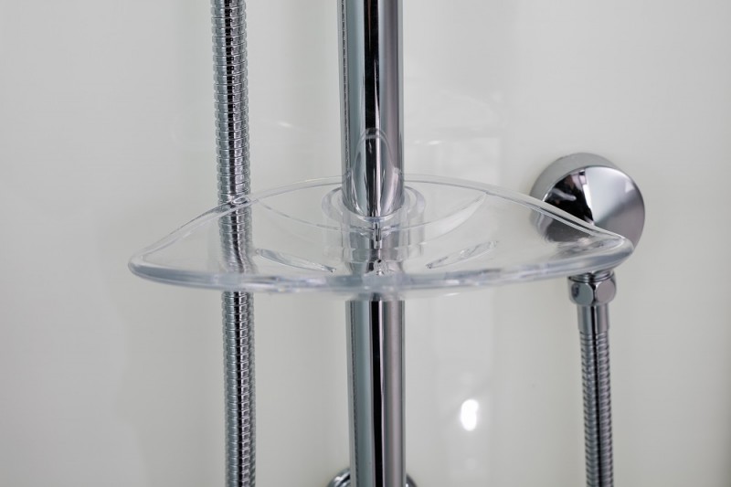 Модель "СR" - угловая кабина со стеклянной крышей, верхним душем с прорезиненными соплами и вентиляционным отверстием. Низкий поддон. Сифон с гидрозатвором. Стекло: 5 мм, переднее - "матовое". заднее - "белое крашеное". Комплектующие: большое овальное зеркало с фацетом, полочка со стаканчиком, смеситель, 5-ти режимная душевая лейка на стойке, мыльница, двойные ролики.