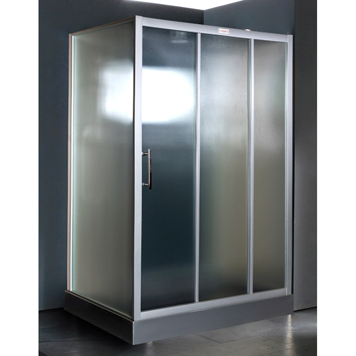 Поддон из серого акрила. Задние стенки и крыша: "стекло серое крашеное". Цвет стёкол максимально соответствует цвету поддона. В комплекте: смеситель, душевая многофункциональная лейка, тропический душ, вентиляционная решетка, штанга с держателем и мыльницей, крючки для мочалки, большое зеркало с фацетом 30х69, стеклянная полочка (65 см) с отверстием под стакан и ограничителем, стеклянный стакан, двойные (спаренные) верхние ролики.