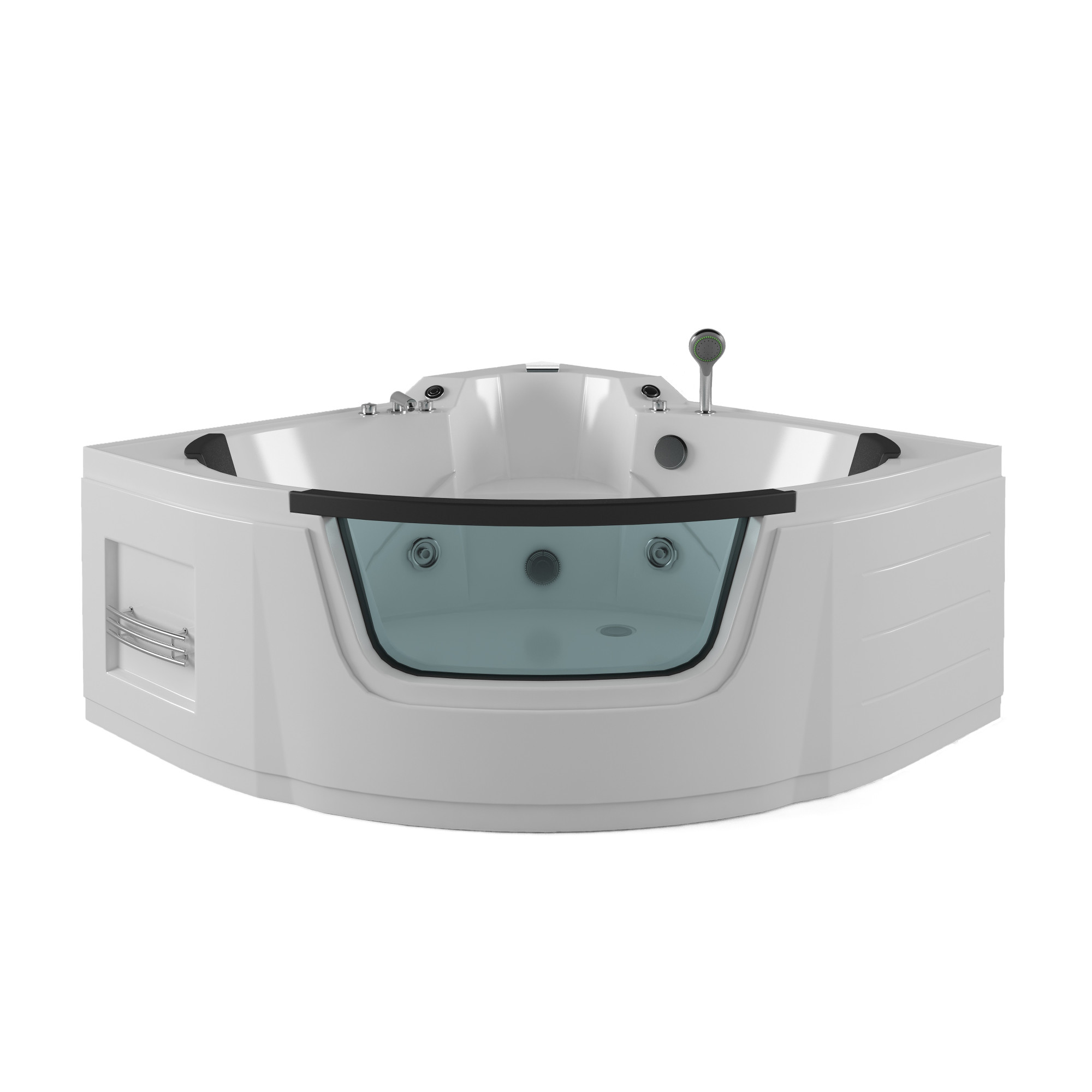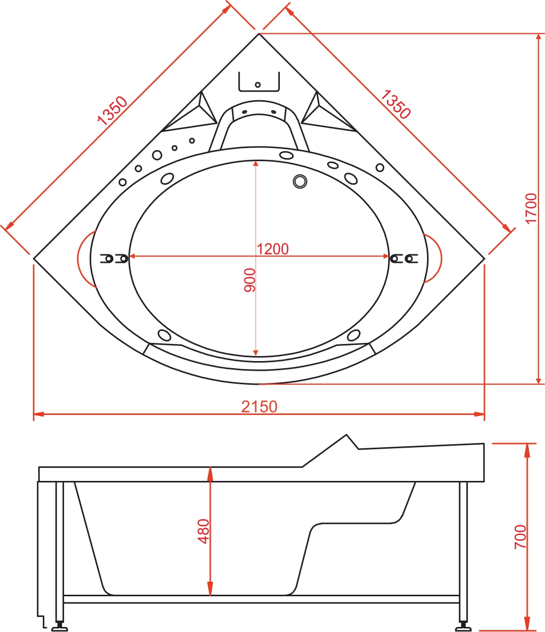 | Комплектация | Каркас||ванна||регулятор воздушного потока||4 маленькие форсунки||4 большие поворотные форсунки||встроенный латунный смеситель||излив «водопад»||переключатель излив/лейка||сифон полуавтоматический с переливом||воздушный переключатель (пневмо-кнопка)||электродвигатель||подголовник 2 шт |