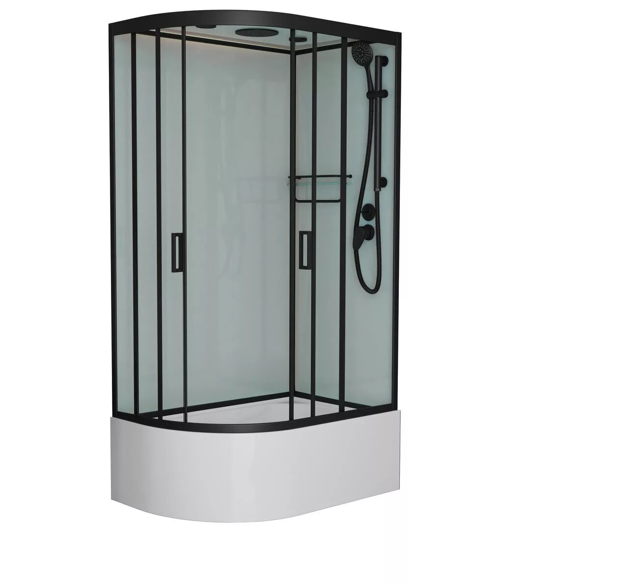 Душевая кабина Frank F412/2R М Black правосторонняя высокий поддон от немецкого производителя Frank – комфортная и просторная модель. Закаленное стекло толщиной 5 мм надежно фиксируется алюминиевым профилем. Конструкцию устанавливают на акриловый поддон. В комплекте душевой гарнитур, сифон, вешалка, смеситель, полочка, тропический (верхний) душ.