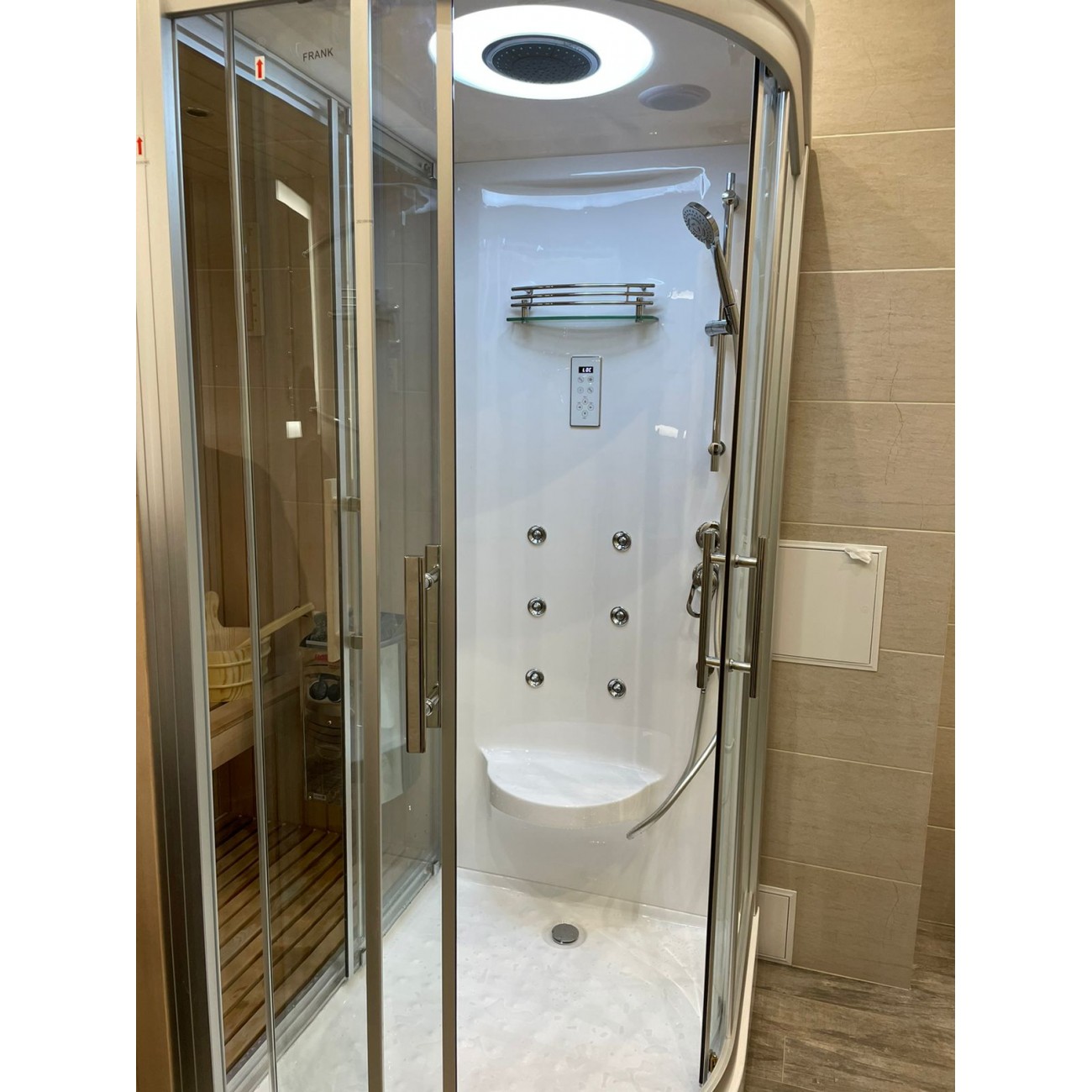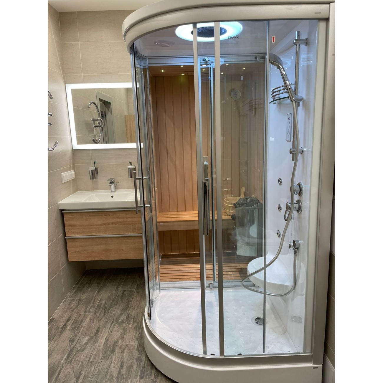 Если Вы хотите организовать настоящую сауну в своем доме, лучший вариант — это душевая кабина, совмещённая с финской сауной от производителя Frank. Она объединяет как обычную душевую кабину, так и сауну. В общем боксе находятся сразу два отделения: одно с душем, другое — с финской сауной. Между отделениями есть дверь, через которую можно пройти, непосредственно, во время процедур.