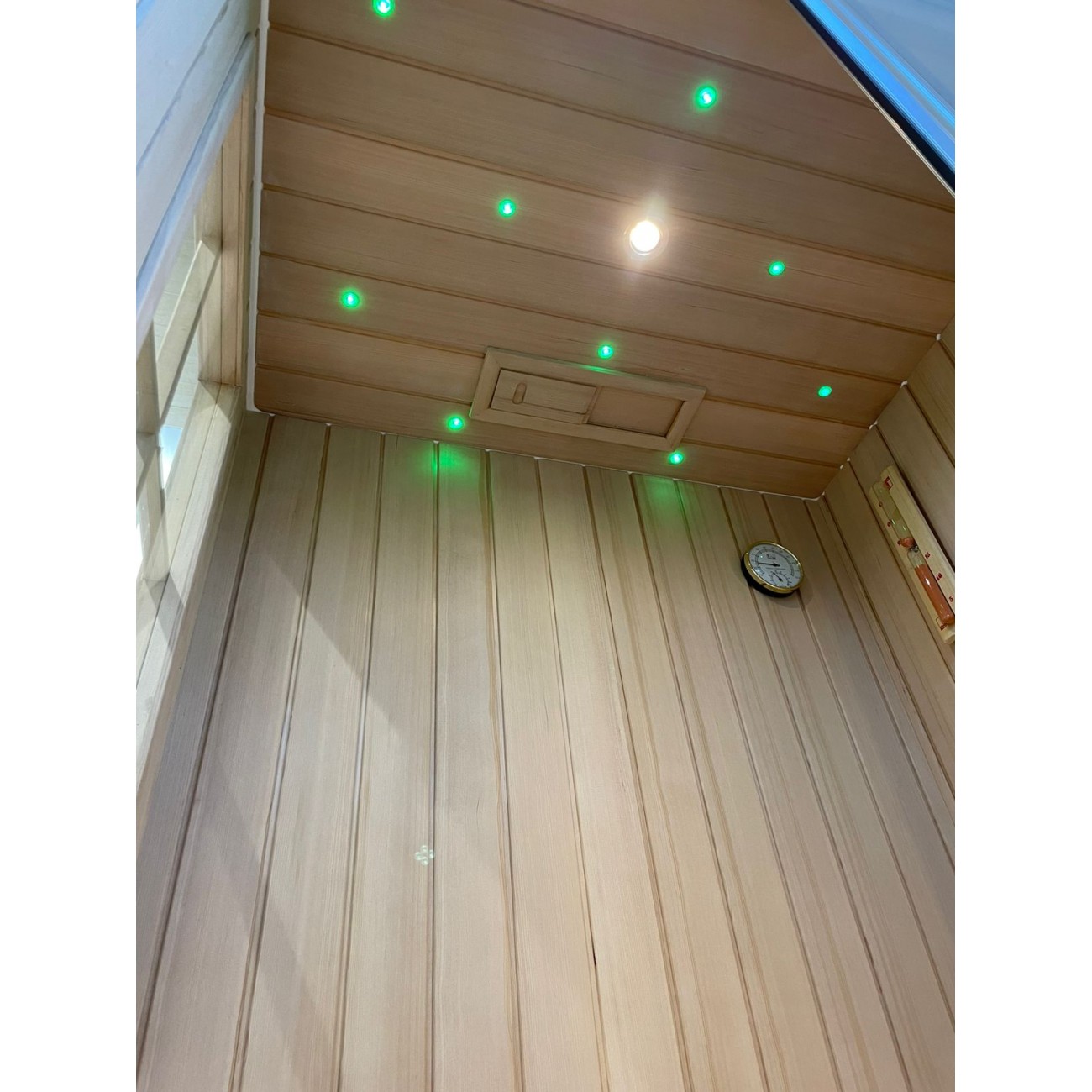 В отделении сауны находится лавочка из кедра, настил деревянный с сифоном, который соединяется с душевой кабиной через тройник. Сердце сауны - печь Harvia Vega Compact BC35 на 3.5KW с камнями, кадушка,черпак,часы песочные,термометр. Изюминка сауны - это Led подсветка по периметру потолка с дистанционным пультом управления на 6 цветов. В сочетании с музыкой от Bluetooth cоздаётся приятная атмосфера в сауне Frank.