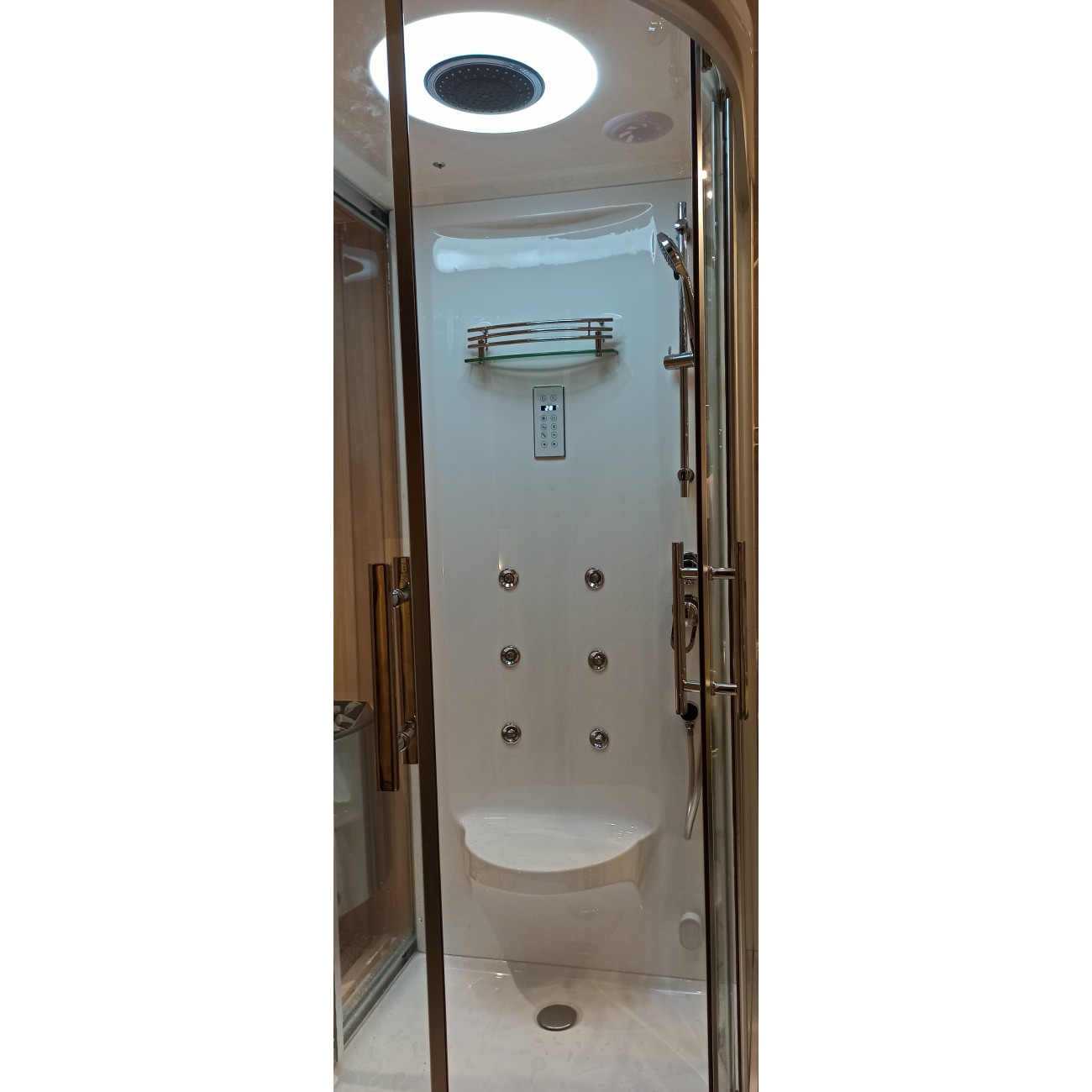 В отделении душевой кабины находятся 6 гидромассажных форсунок, ручная лейка на штанге и сенсорный пульт управления с системой вентиляции и подсветки,парогенератор по желанию.Кабина имеет низкий 15-и сантиметровый поддон, усиленный металлическим каркасом и нагрузка на такой поддон достигает более 400 кг. Стенки и двери кабины выполнены из закаленного ударопрочного 6 миллиметрового стекла, а профиля конструкции из высокопрочного алюминия. В данной модели раздвижные двери с металлическими магнитами.