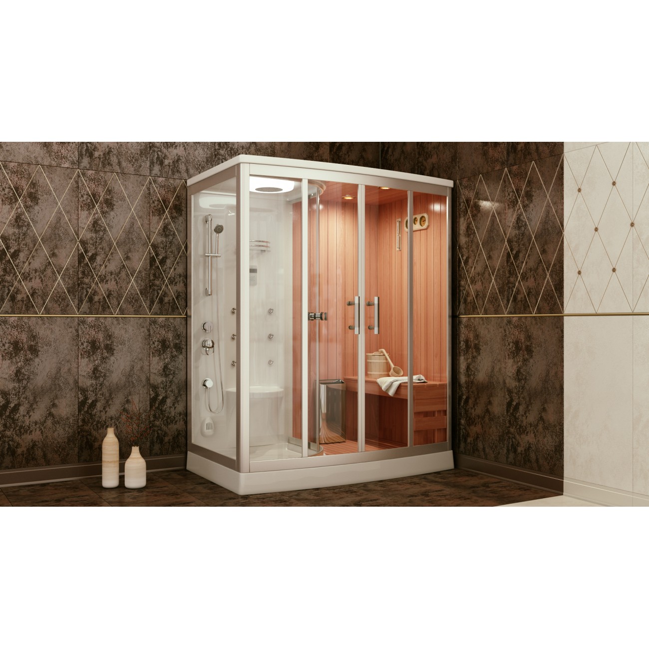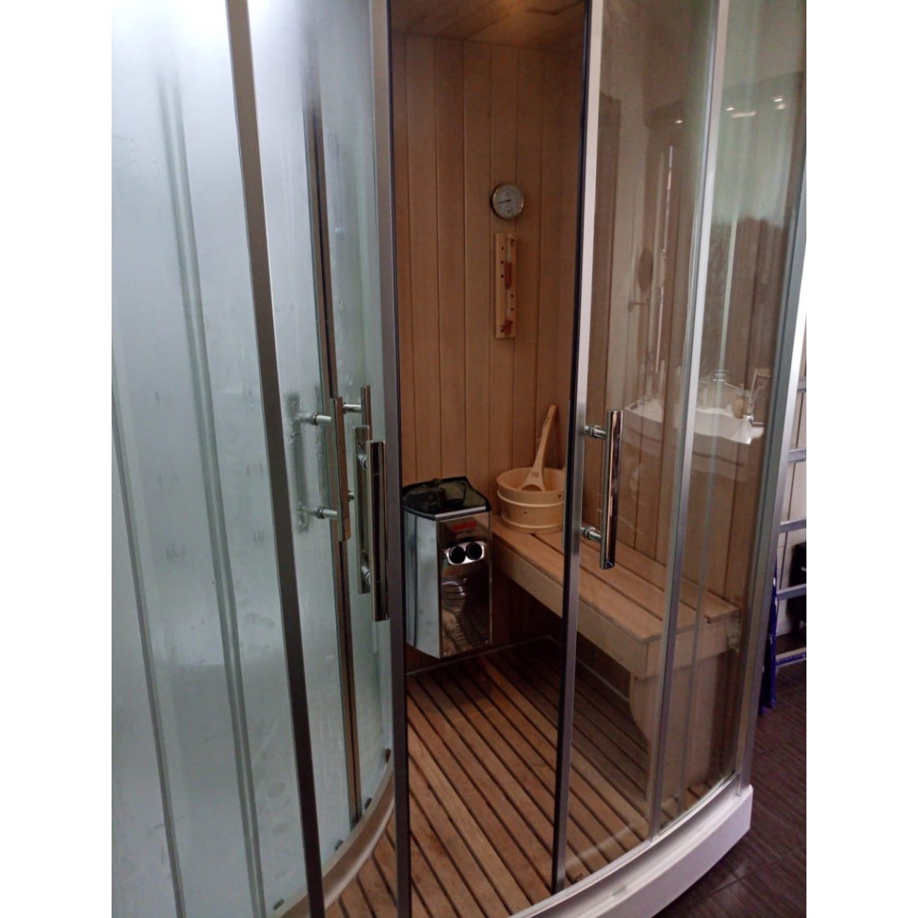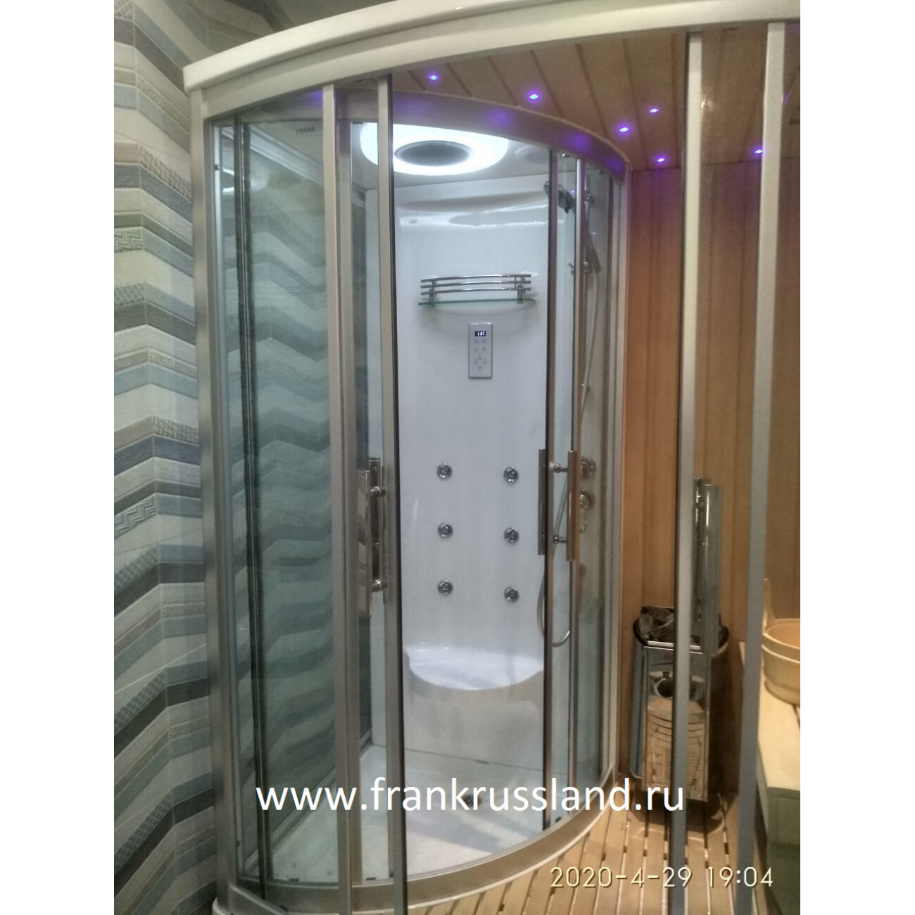 Если Вы хотите организовать настоящую сауну в своем доме, лучший вариант — это душевая кабина, совмещённая с финской сауной от производителя Frank. Она объединяет как обычную душевую кабину, так и сауну. В общем боксе находятся сразу два отделения: одно с душем, другое — с финской сауной. Между отделениями есть двери, через которые можно пройти, непосредственно, во время процедур.