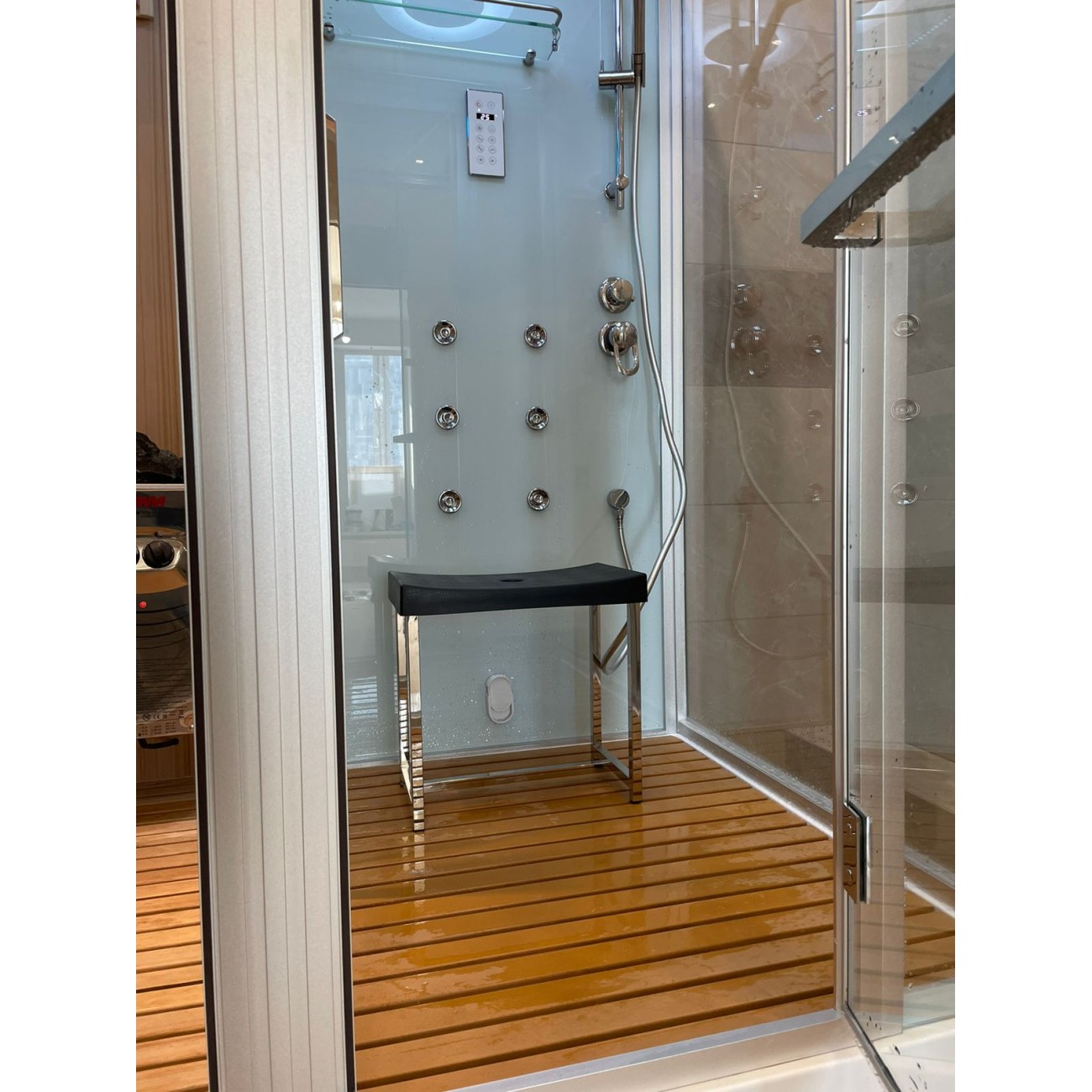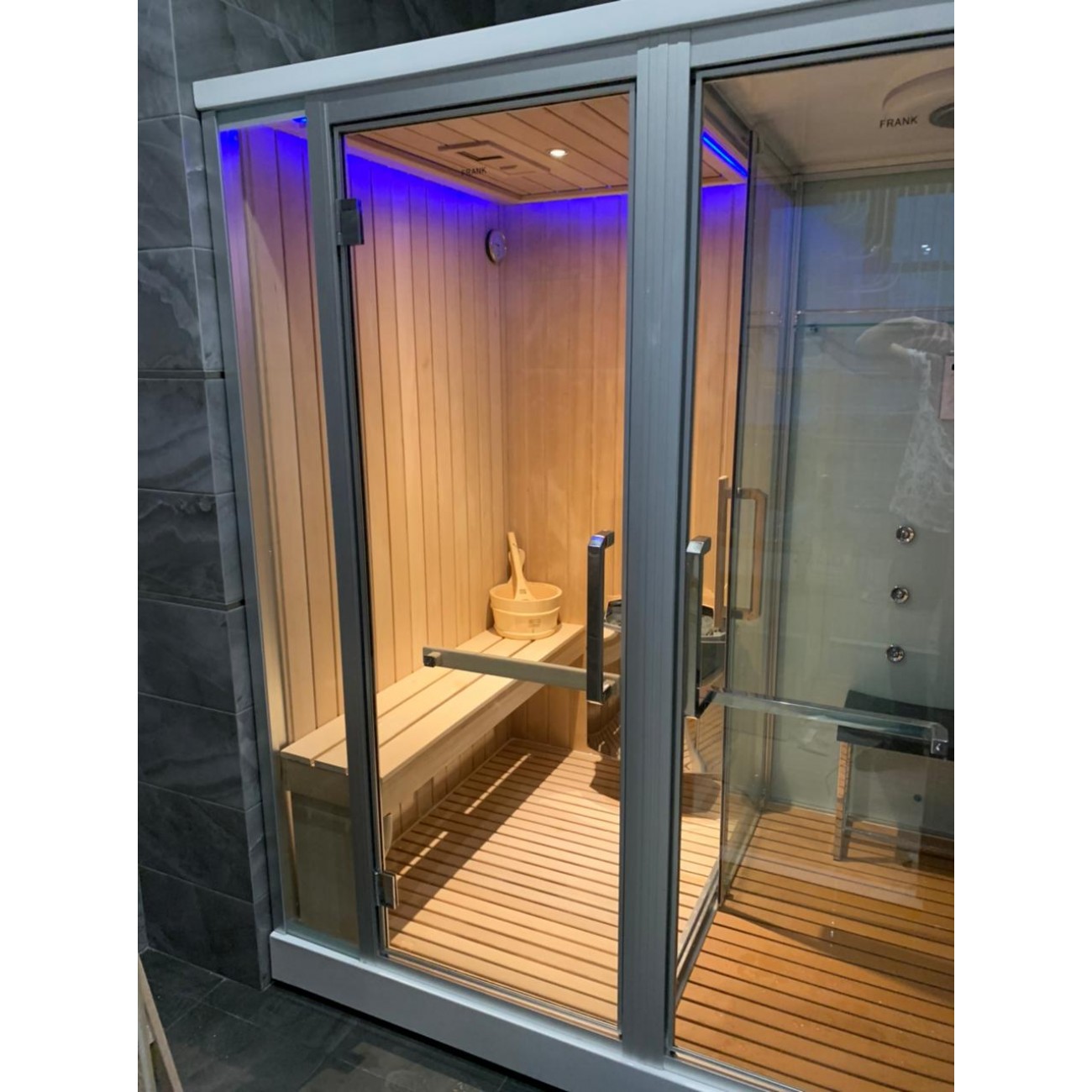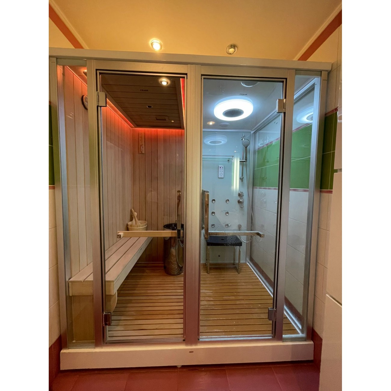 Если Вы хотите организовать настоящую сауну в своем доме, лучший вариант — это душевая кабина, совмещённая с финской сауной от производителя Frank. Она объединяет как обычную душевую кабину, так и сауну. В общем боксе находятся сразу два отделения: одно с душем, другое — с финской сауной. Между отделениями есть дверь, через которую можно пройти, непосредственно, во время процедур.