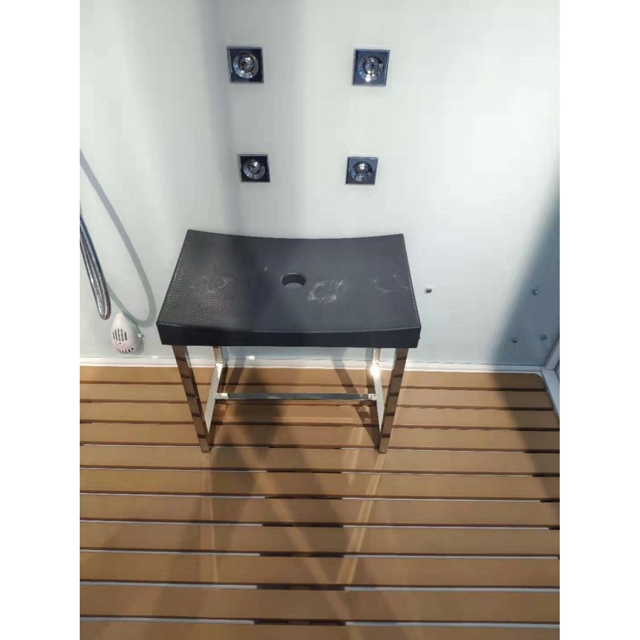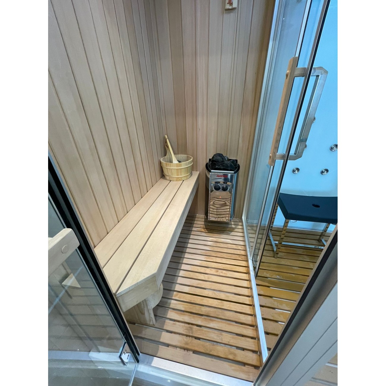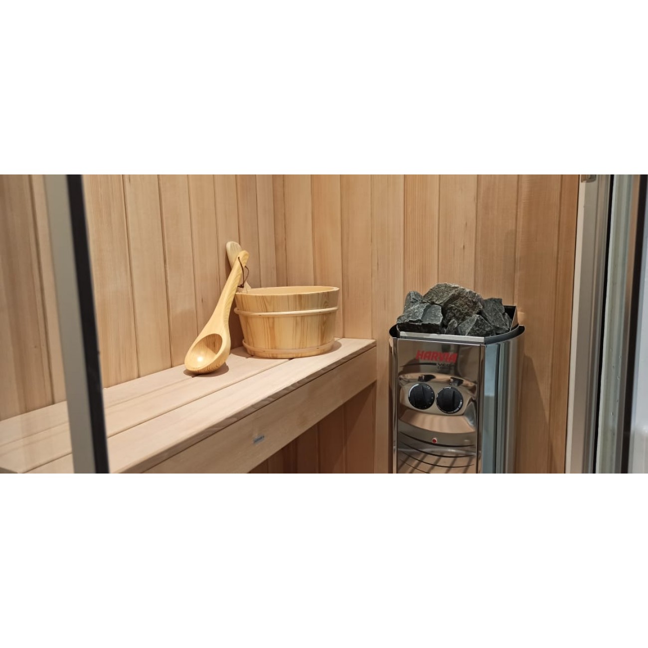 В отделении сауны находится лавочка из кедра, настил деревянный с сифоном, который соединяется с душевой кабиной через тройник. Сердце сауны - печь Harvia Vega Compact BC35 на 3.5KW с камнями, кадушка,черпак,часы песочные,термометр. Изюминка сауны - это Led подсветка по периметру потолка с дистанционным пультом управления на 6 цветов. В сочетании с музыкой от Bluetooth cоздаётся приятная атмосфера в сауне Frank.